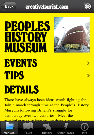 Working at OH Digital, I planned, designed and developed an iPhone app for Creative Tourist and the Manchester Museums Consortium.